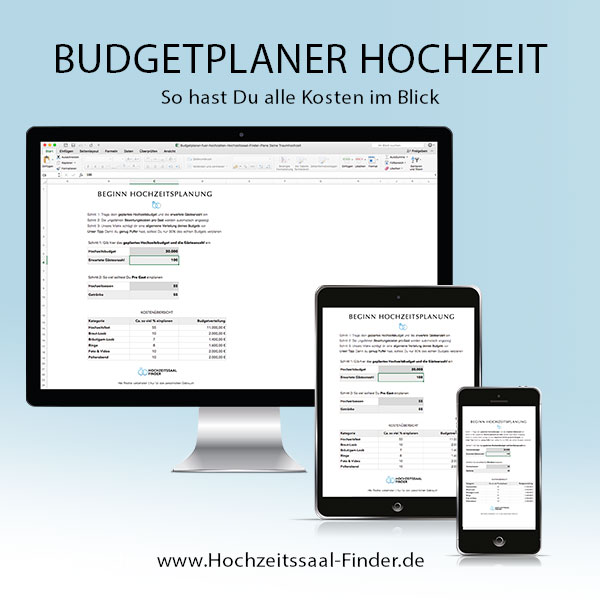 Mit dem Hochzeitssaal-Finder Budgetplaner Hochzeit hast Du alle Kosten zur standesamtlichen Trauung, kirchlichen Trauung, Hochzeitsfeier, zum Polterabend und den Flitterwochen detailliert im Überblick. Jetzt den Budgetplaner Hochzeit gratis downloaden und die Kosten zur Hochzeit perfekt im Blick haben!