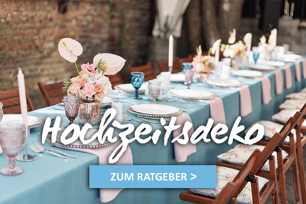 Du planst Deine Hochzeit selbst und bist auf der Suche nach Inspirationen für die Hochzeit? Eine traumhafte Hochzeit benötigt eine detaillierte Hochzeitsplanung. In unserem Hochzeitsratgeber erfährst Du alles über die neusten Hochzeits-Trends, schönste Hochzeitslocations und die besten Hochzeits-Diensleister. In unserem Hochzeitsratgeber erfährst Du alle Tipps und Ideen, für eine perfekte und sorgenfreie Hochzeitsplanung. Unser Budgetplaner für die Hochzeit, Excel-Tabellen für die Gästeliste, Checklisten zur Auswahl der perfekten Hochzeitslocation und viele weitere Planungshilfen – mit Hochzeitssaal-Finder kannst Du Deine Hochzeit ganz einfach selbst planen.